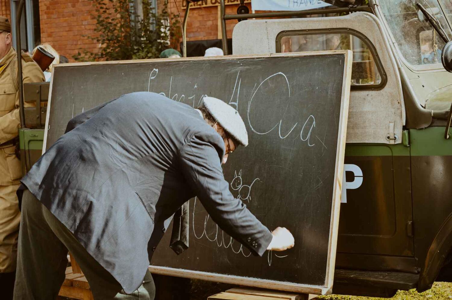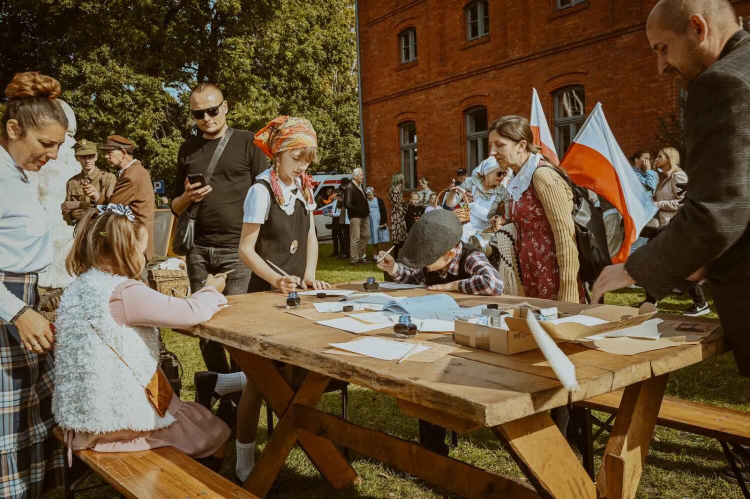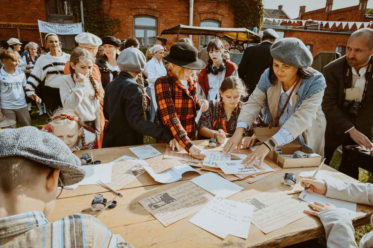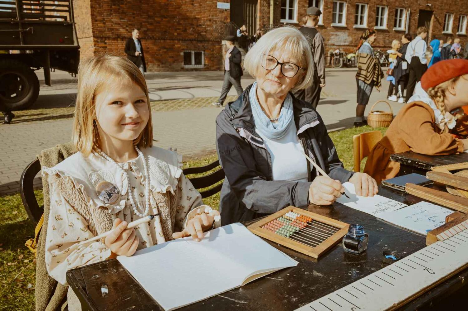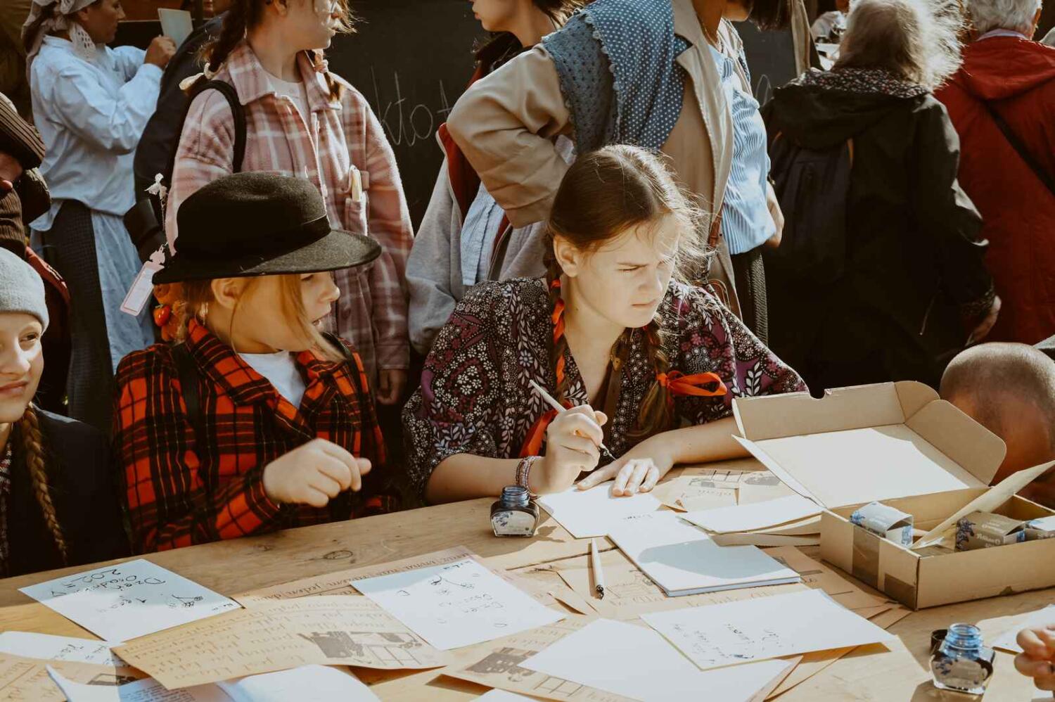 Dzięki pięknym szkolnym eksponatom od Wiesia z U Młynarza – Zagroda Edukacyjna w Mokrym Dworze oraz z izby pamięci przy Szkole Podstawowej w Ostaszewie nasz Osadniczy Nauczyciel Franciszek z SGO poprowadził lekcję języka polskiego dla dorosłych analfabetów. Chętni mogli też wziąć udział w warsztacie kaligrafii, prowadzonym przez Szymona Paczkowskiego. A najmłodsi w ramach „przerwy” mogli wspólnie z Mają Rausch stworzyć lalkę szmaciankę.