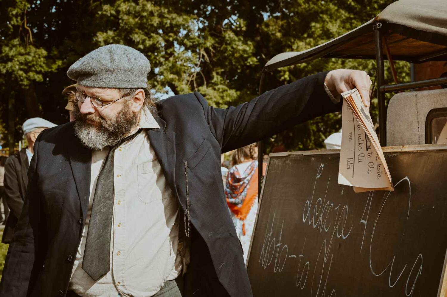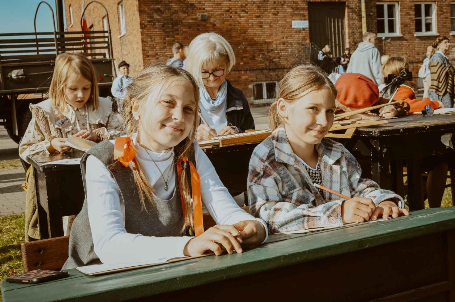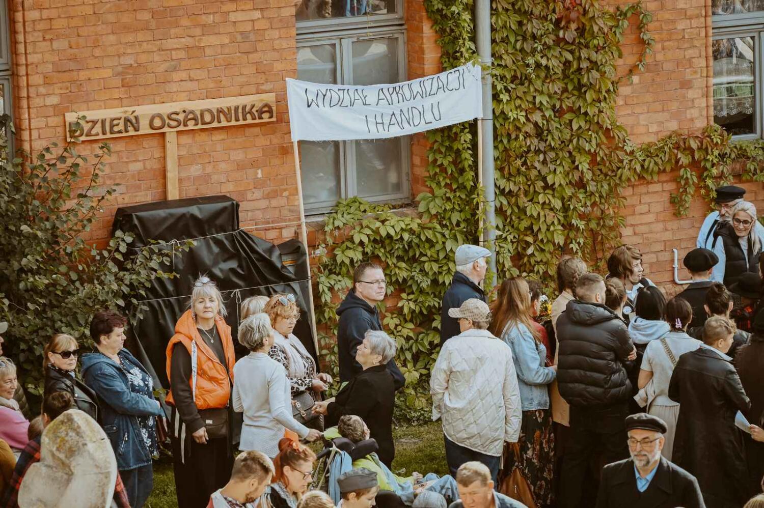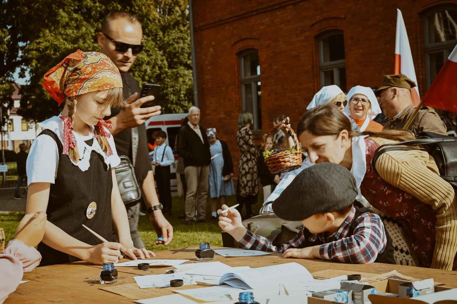 Dzięki pięknym szkolnym eksponatom od Wiesia z U Młynarza – Zagroda Edukacyjna w Mokrym Dworze oraz z izby pamięci przy Szkole Podstawowej w Ostaszewie nasz Osadniczy Nauczyciel Franciszek z SGO poprowadził lekcję języka polskiego dla dorosłych analfabetów. Chętni mogli też wziąć udział w warsztacie kaligrafii, prowadzonym przez Szymona Paczkowskiego. A najmłodsi w ramach „przerwy” mogli wspólnie z Mają Rausch stworzyć lalkę szmaciankę.