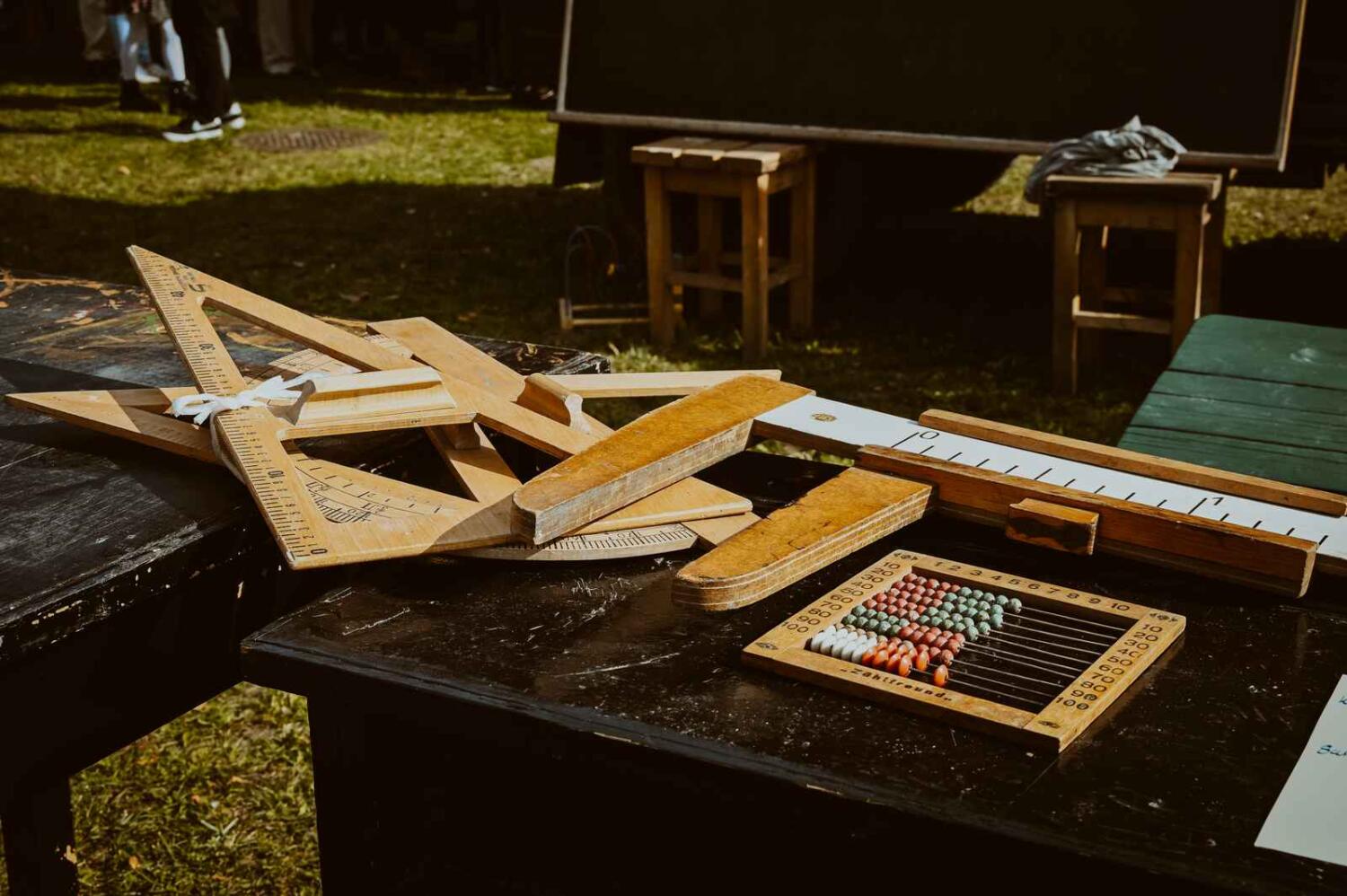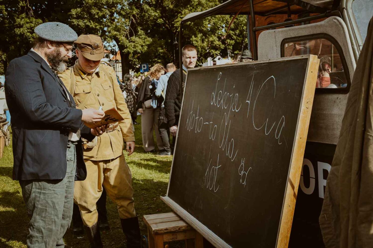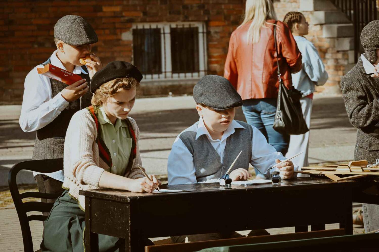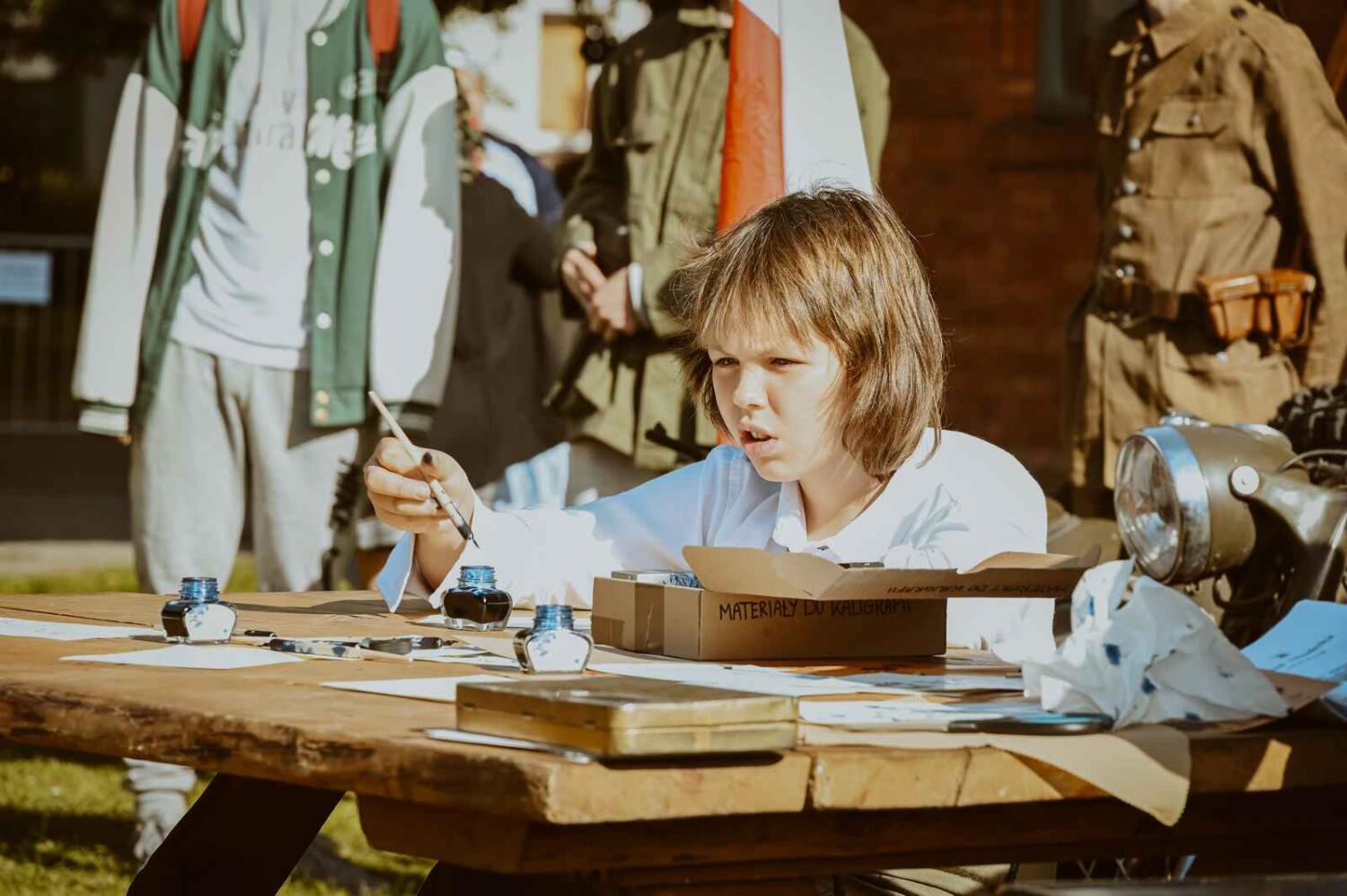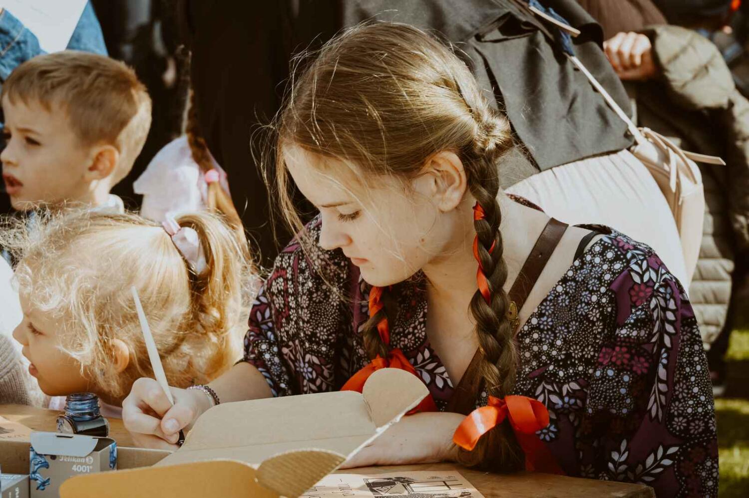 Dzięki pięknym szkolnym eksponatom od Wiesia z U Młynarza – Zagroda Edukacyjna w Mokrym Dworze oraz z izby pamięci przy Szkole Podstawowej w Ostaszewie nasz Osadniczy Nauczyciel Franciszek z SGO poprowadził lekcję języka polskiego dla dorosłych analfabetów. Chętni mogli też wziąć udział w warsztacie kaligrafii, prowadzonym przez Szymona Paczkowskiego. A najmłodsi w ramach „przerwy” mogli wspólnie z Mają Rausch stworzyć lalkę szmaciankę.