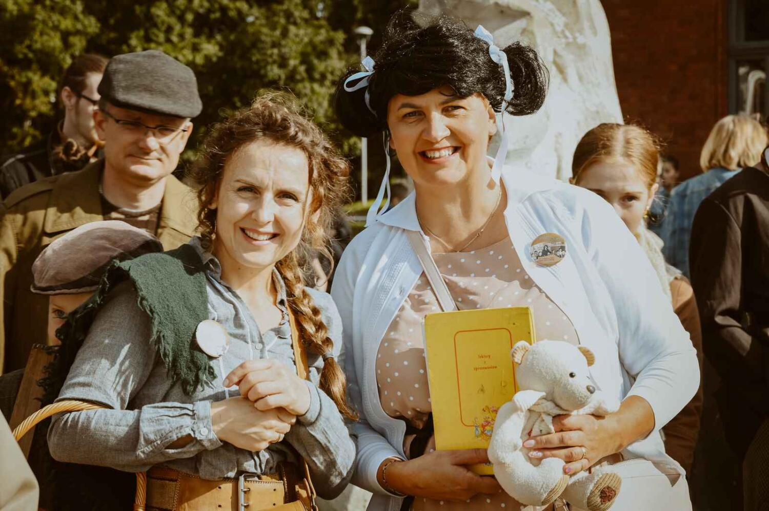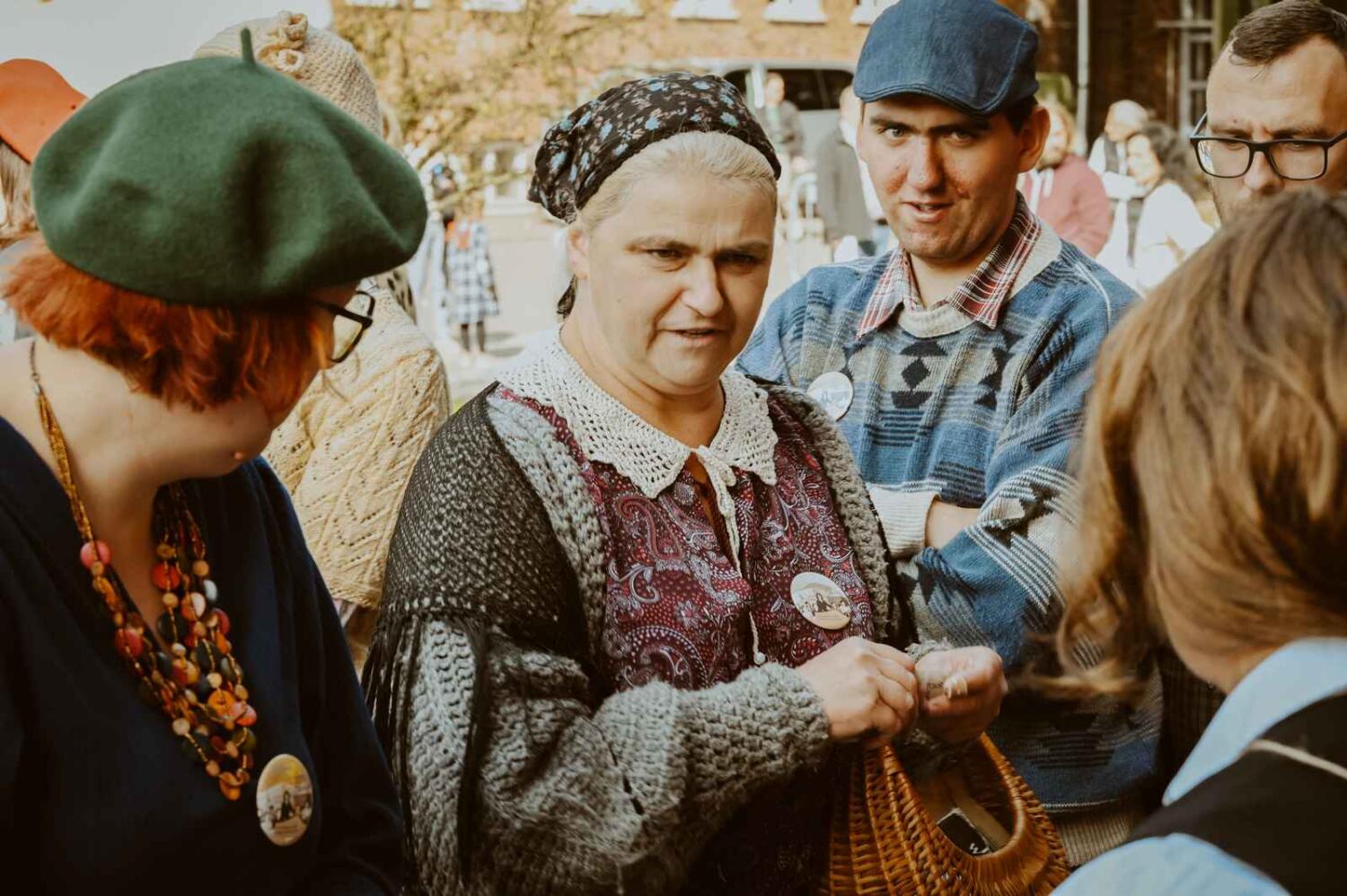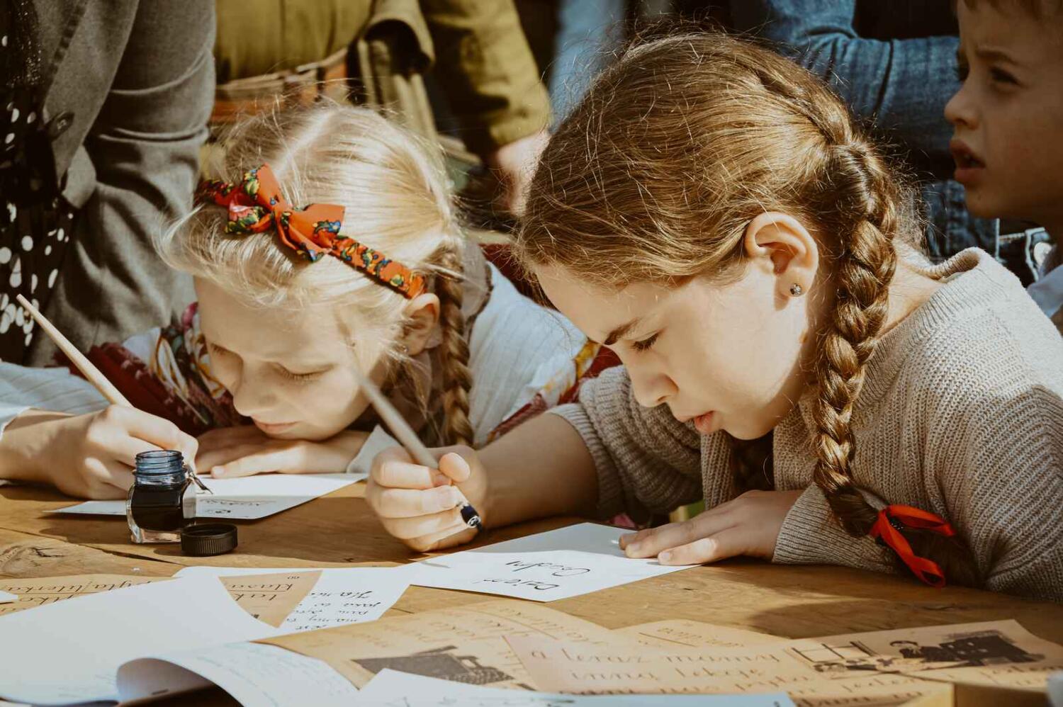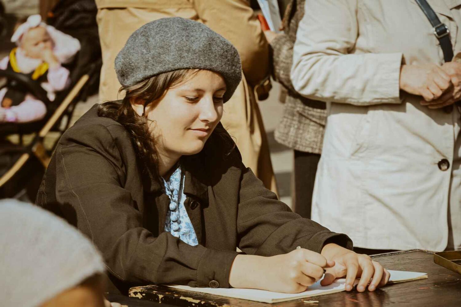 Dzięki pięknym szkolnym eksponatom od Wiesia z U Młynarza – Zagroda Edukacyjna w Mokrym Dworze oraz z izby pamięci przy Szkole Podstawowej w Ostaszewie nasz Osadniczy Nauczyciel Franciszek z SGO poprowadził lekcję języka polskiego dla dorosłych analfabetów. Chętni mogli też wziąć udział w warsztacie kaligrafii, prowadzonym przez Szymona Paczkowskiego. A najmłodsi w ramach „przerwy” mogli wspólnie z Mają Rausch stworzyć lalkę szmaciankę.